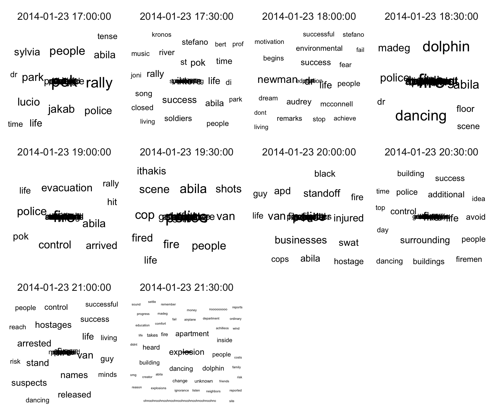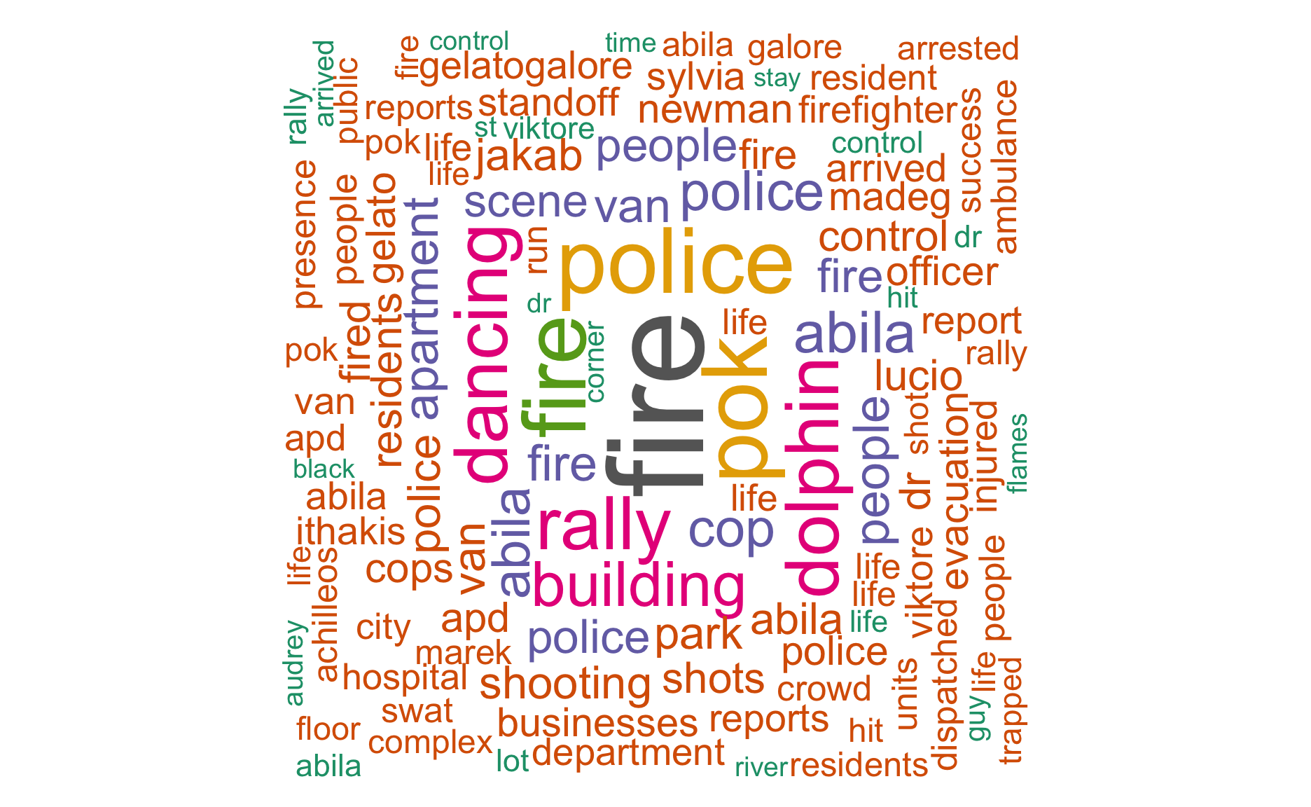 Microblog records that have been identified by automated filters as being potentially relevant to the ongoing incident Text transcripts of emergency dispatches by the Abila, Kronos local police and fire departments.