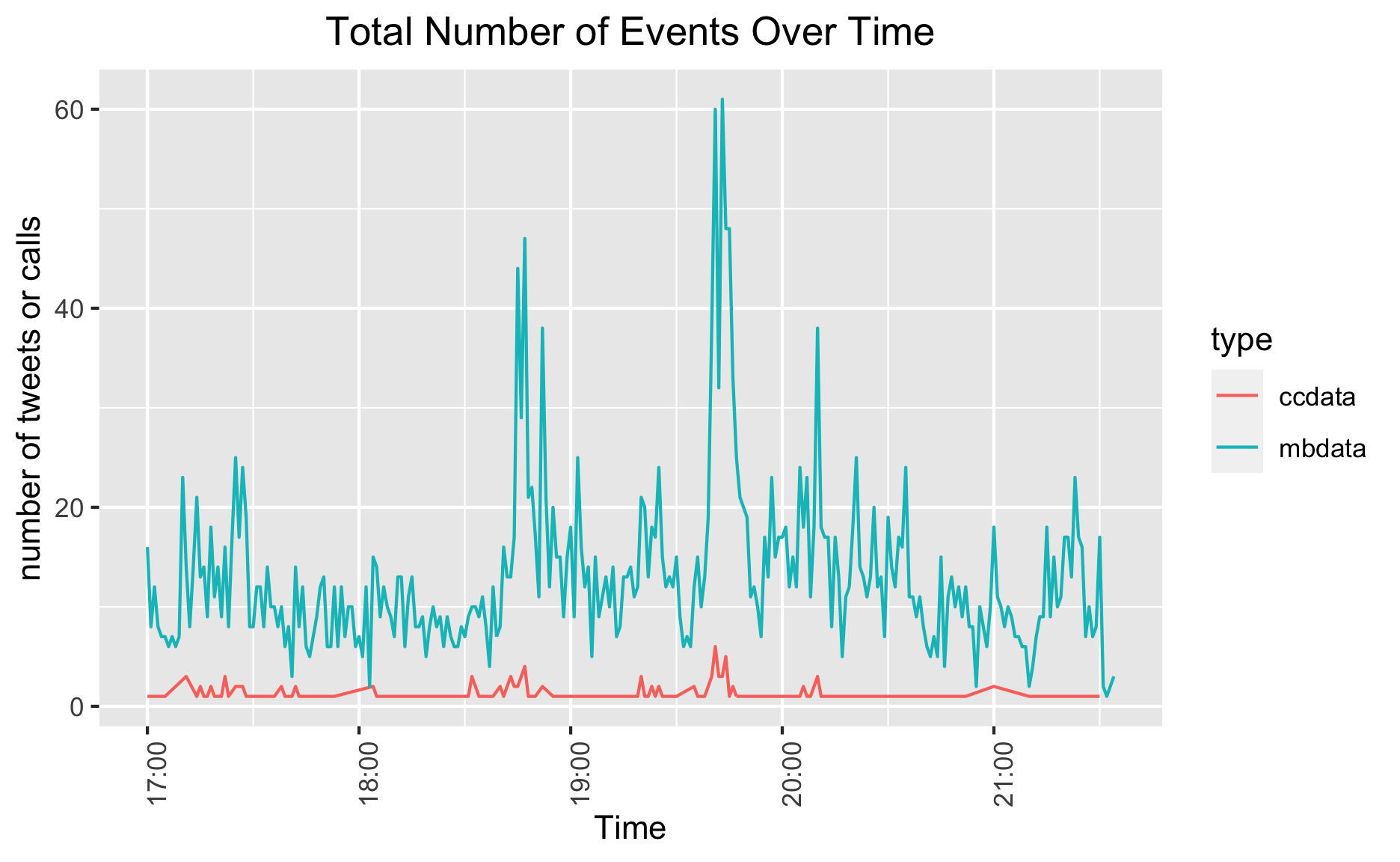 Another way to investigate the risk levels over time is to plot the number of events including microblogs and emergency calls over time. From the graph, we can detect a few active time periods with high frequency. The peaks of two types of events are observed during time interval 18:40-18:55, 19:40-19:50 and 20:10:00.