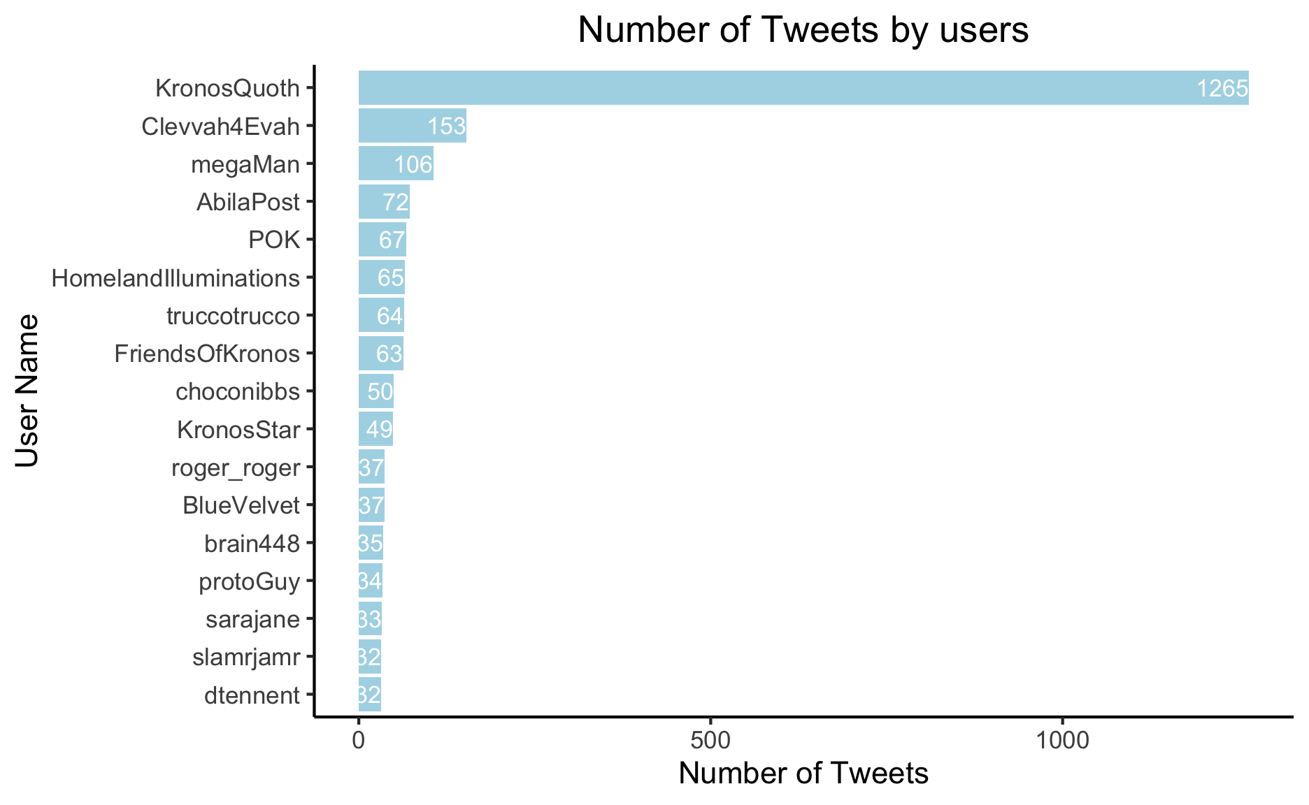 By counting the frequency of tweets for individual users, we can identify active tweets users like KronosQuoth, Clevvah4Evah, megaMan, AbilaPost and POK. They posted a lot of tweets but it may include retweets from other users. We need further analysis to see if they create original messages or just repost other people’s tweets.