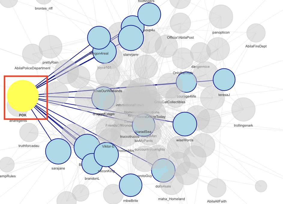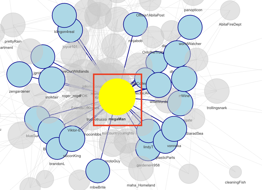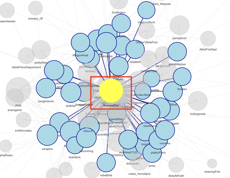 Comparing this network graph with the bar chart in section 4.1, we can find that KronosQuoth and Clevvah4Evah (top 1 and 2 who posted tweets) are at the edge of the network and don’t have any link with other users. We can exclude them from our analysis. megaMan and POK has some influence in their respective networks. KronosStar, Homeandilluminations and some media accounts (e.g. AbilaPost and NewsOnlineToday) are more influential tweets users and their messages could be more meaningful.