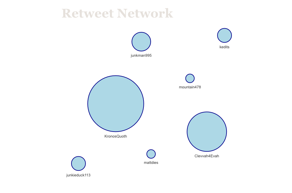 In the first part initial EDA, we only count the number of tweets per user. Many of them reposted other people’s tweets and should be considered as spams/junk messages. In order to study the relationships between different users and detect meaningful messages, we could draw interactive retweets network graph using visNetwork package. By constructing retweet network oject with edges and nodes, we can know those influential users who are usually retweeted by other users and those users who tweeted a lot while are not quoted by other users. With this interactive graph, we can also identify network communities by clicking the users who are at the center of the network.